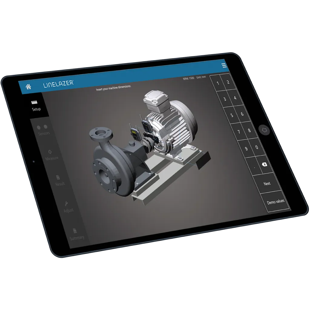 With the LineLazer app, getting the work done is easier than ever. The app guides the user through the entire alignment process in an intuitive manner, using a visually appealing and intelligible 3D graphical interface. The possibility to rotate the virtual machine for a live 3D view from any direction facilitates understanding, while the continuous sweep function – enabling measurement during rotation – saves considerable time and effort.