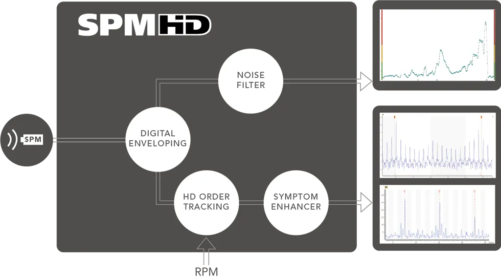 Advanced digital technique and RPM-based sampling frequency make SPM HD particularly well suited for measurement on low-speed applications. Sophisticated mathematics algorithms make the measuring technique less sensitive to interference from other signals. Extraordinary signal quality and 24 bit A/D conversion provide razor-sharp resolution and exceptional detail in spectrums and time signals. Time signals are very easily interpreted, making the type and extent of the damage simple to determine. SPM HD can be used to monitor applications in the 0.1 - 20 000 RPM range.