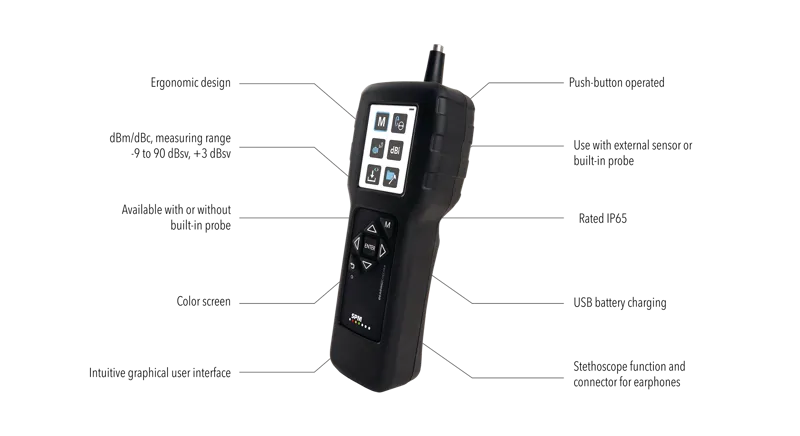 The instrument measures shock pulse levels with a built-in probe or external transducer. It can also be used as an electronic stethoscope for detecting machine sound irregularities.