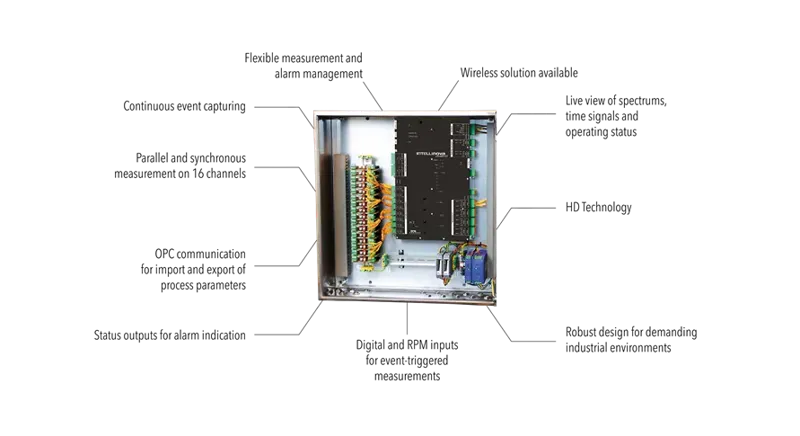 With parallel vibration or shock pulse measurement on up to thirty-two channels, the system is a perfect fit where short process cycles make condition measurement time-critical.