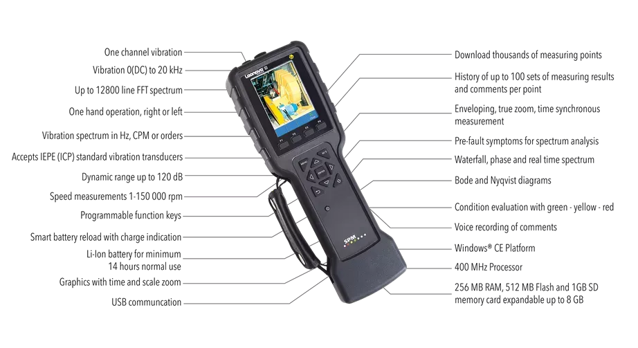 Leonova Emerald includes High Definition Shock Pulse Method (SPM HD®) for bearing condition and advanced vibration analysis for general machine condition and more features, see below.