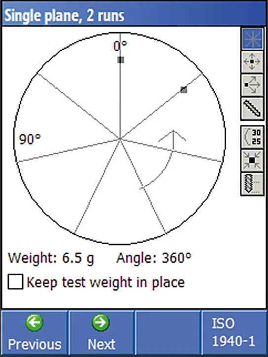 Field rotor balancing in single plane according to ISO 1940-1 standard with an initial vibration measurement guiding the user through a balancing procedure with suggestions for correcting the imbalance.