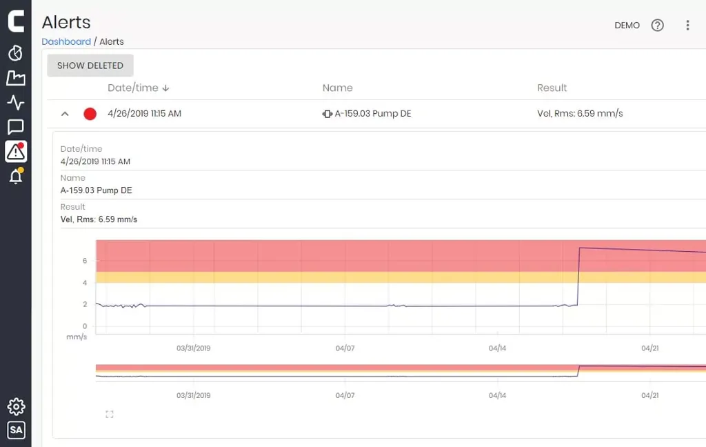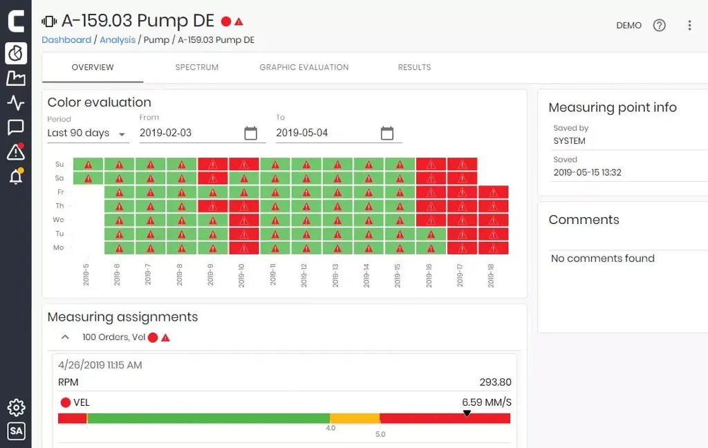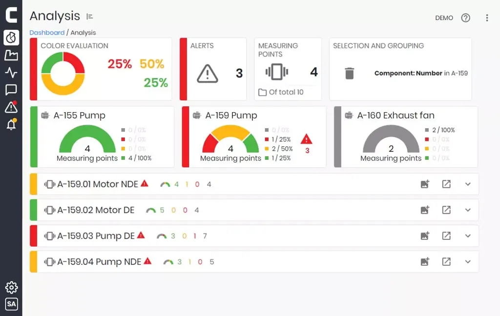 - View the current condition status of all measuring points, as well as alerts and issues on machine, component, and measuring point level.