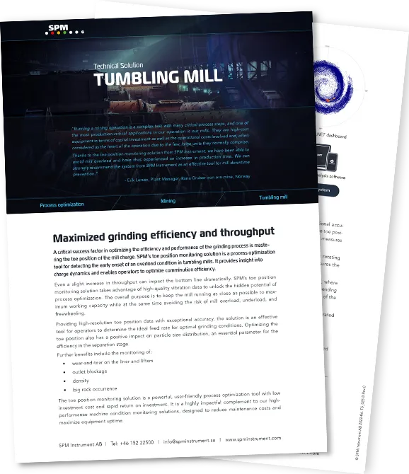 SPM Instrument offers advanced solutions to optimize key processes in the mining sector, boosting efficiency and profitability. Our tumbling mill grinding solution monitors the charge toe position at the inlet and discharge ends of the mill drum, helping operators find the ideal feed rate for optimal grinding and particle size distribution. This system also tracks issues like mill overload, liner wear, outlet blockages, and large rock occurrences to enhance operational reliability.