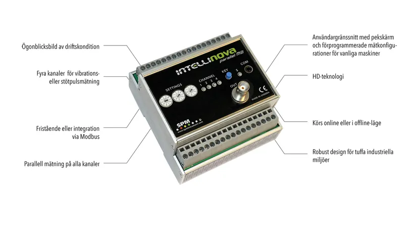 Intellinova Parallel MB tillhandahåller avancerad vibrationsanalys och stötpulsövervakning i en liten, högpresterande förpackning, väl lämpat för en mängd olika industriella maskiner.