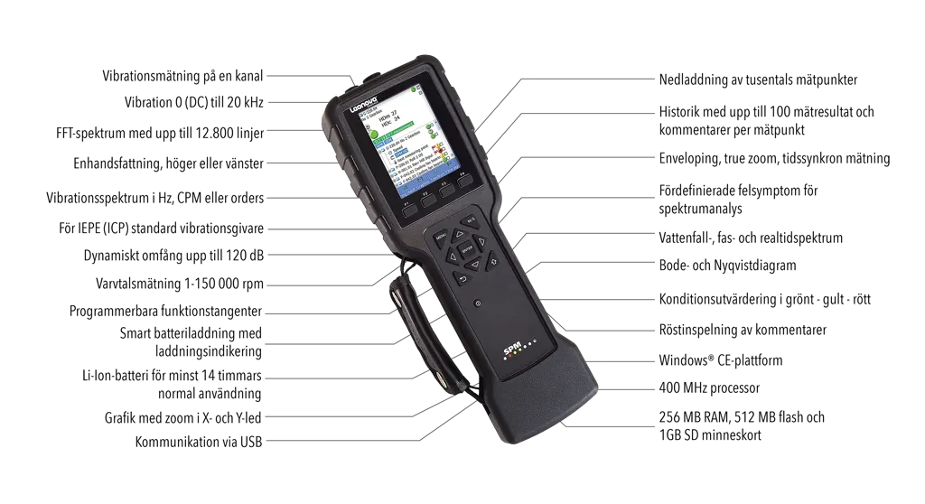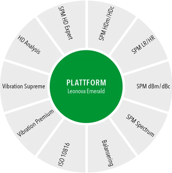 Leonova Emerald inkluderar High Definition Shock Pulse Method (SPM HD®) för mätning av lagerkondition och avancerad vibrationsanalys för diagnosticering av allmän maskinkondition, samt många fler funktioner, se nedan.