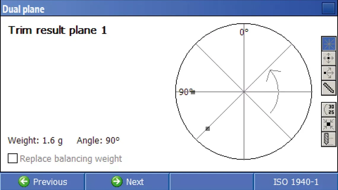 Rotorbalansering på fältet i ett och två plan i enlighet med standarden ISO 1940-1 med en inledande vibrationsmätning vägleder användaren genom balanseringsproceduren och ger flera alternativ för att korrigera obalansen.